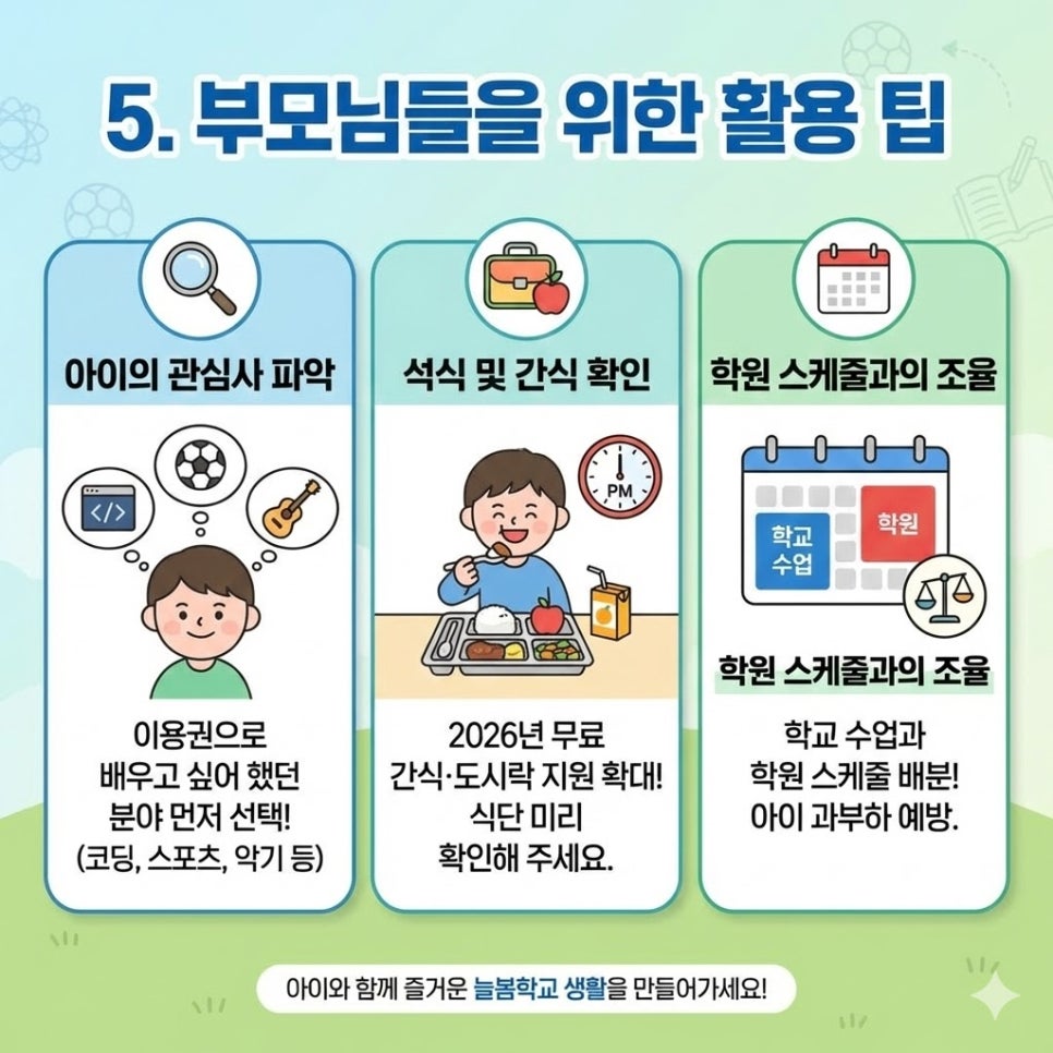 3. 지역사회 연계: 학교 공간이 부족할 경우 인근 도서관이나 청소년 수련관에서 진행되는 ‘지역 연계형 늘봄’ 프로그램도 수강권으로 이용 가능하니 범위를 넓혀보세요.